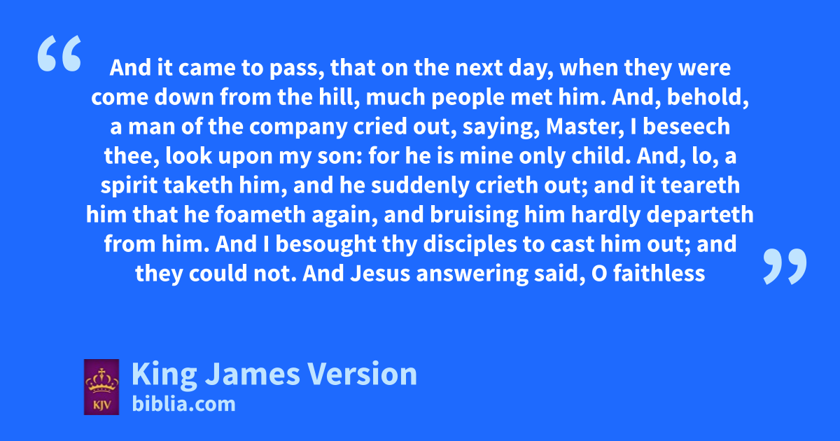 37 And it came to pass, that on the next day, nwhen they were come down from nnthe hill, much people met him. 38 And, behold, a man of the company cried out, saying, Master, I beseech thee, olook upon my son: for he is pmine only child. 39 And, lo, a spirit taketh him, and he suddenly ppcrieth out; and it qteareth him that he foameth again, and bruising him hardly departeth from him. 40 And I besought thy disciples to cast him out; and they could not. 41 And Jesus answering said, O faithless and perverse generation, how long shall I be with you, and suffer you? Bring thy son hither. 42 And as he was yet a coming, the devil threw him down, and tare him. And Jesus rebuked the unclean spirit, and healed the child, and delivered him again to his father.