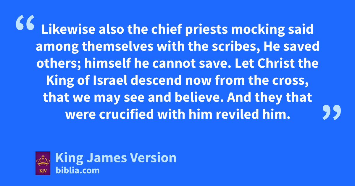 29 And they that passed by railed on him, wagging their heads, and saying, Ah, thou that destroyest the temple, and buildest it in three days, 30 Save thyself, and come down from the cross. 31 Likewise also the chief priests mocking said among themselves with the scribes, He saved others; himself he cannot save. 32 Let Christ the King of Israel descend now from the cross, that we may see and believe. And they that were crucified with him reviled him.