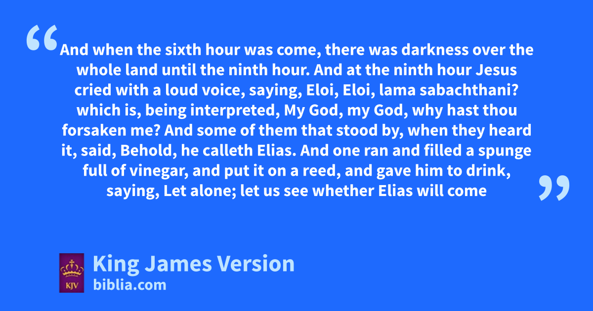 33 And when the sixth hour was come, there was darkness over the whole land until the ninth hour. 34 And at the ninth hour Jesus cried with a loud voice, saying, Eloi, Eloi, lama sabachthani? which is, being interpreted, sMy God, my God, why hast thou forsaken me? 35 And some of them that stood by, when they heard it, said, Behold, he calleth Elias. 36 And one ran and filled a spunge full of vinegar, and put it on a reed, and gave him to drink, saying, Let alone; let us see whether Elias will come to take him down.