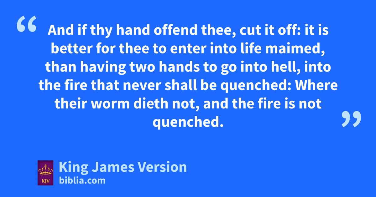 38 cAnd John answered him, saying, Master, we saw one casting out devils in thy name, and he followeth not us: and dwe forbad him, because he followeth not us. 39 But Jesus said, Forbid him not: efor there is no man which shall do a miracle in my name, that can lightly speak evil of me. 40 For fhe that is not against us is on our part. 41 For gwhosoever shall give you a cup of water to drink in my name, because ye belong to Christ, verily I say unto you, he shall not lose his reward. 42 And hwhosoever shall ||offend one of these little ones that believe in me, it is better for him that a millstone were hanged about his neck, and he were cast into the sea. 43 iAnd if thy hand ||offend thee, cut it off: it is better for thee to enter into life maimed, than having two hands to go into khell, into lthe fire that never shall be quenched: 44 Where mtheir worm dieth not, and the fire is not quenched. 45 And nif thy foot ||offend thee, cut it off: it is better for thee to enter halt into life, than having two feet to be cast into khell, into lthe fire that never shall be quenched: 46 Where mtheir worm dieth not, and the fire is not quenched. 47 oAnd if thine eye ||offend thee, pluck it out: it is better for thee to enter into the kingdom of God with one eye, than having two eyes to be cast into khell fire: 48 Where mtheir worm dieth not, and the fire is not quenched. 49 For every one shall be salted with pfire, qand revery sacrifice shall be salted with salt. 50 sSalt is good: stbut if the salt have lost his saltness, wherewith will ye season it? uHave salt in yourselves, and xhave peace yone with another.