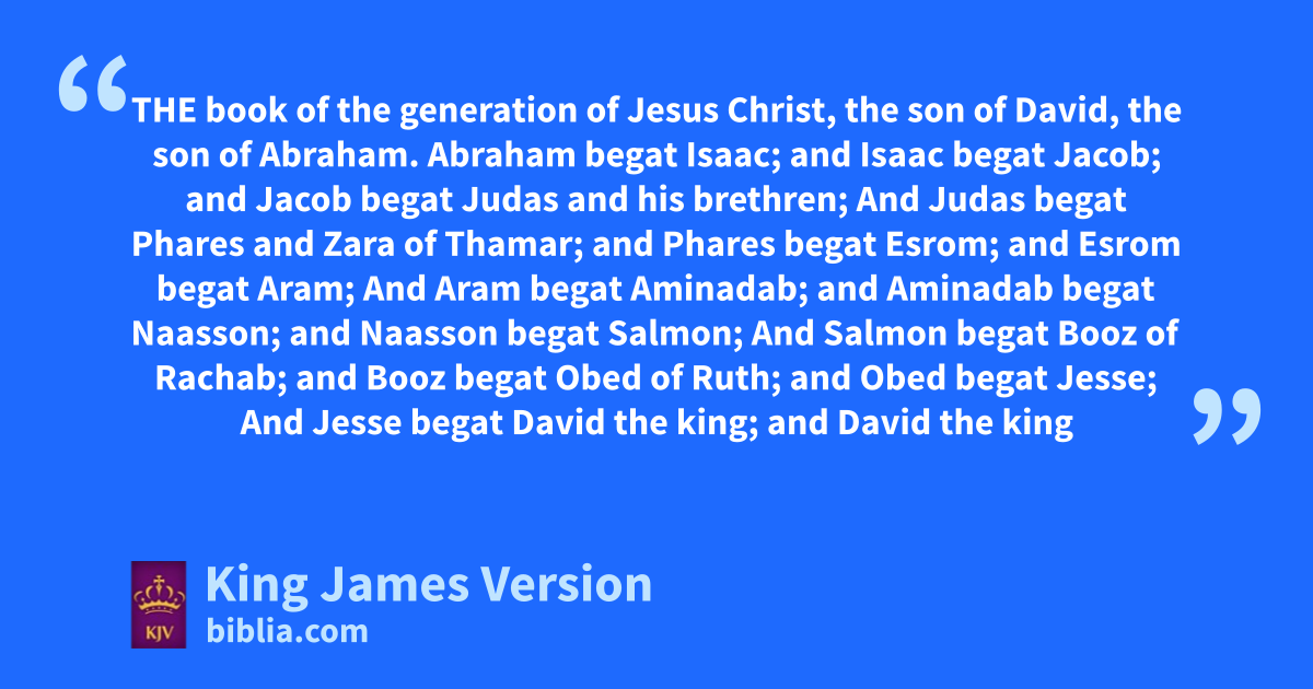 1 The abook of the generation of Jesus Christ, bthe son of David, cthe son of Abraham. 2 dAbraham begat eIsaac; and Isaac begat fJacob; and gJacob begat Judas and his brethren; 3 And hJudas begat Phares and Zara of Thamar; and iPhares begat Esrom; and Esrom begat Aram; 4 And Aram begat Aminadab; and Aminadab begat Naasson; and Naasson begat Salmon; 5 And Salmon begat Booz of kRachab; and Booz begat Obed of Ruth; and Obed begat Jesse; 6 And lJesse begat David the king; and mDavid the king begat Solomon of her that had been the wife of Urias; 7 nAnd Solomon begat Roboam; and Roboam begat Abia; and Abia begat Asa; 8 And Asa begat Josaphat; and Josaphat begat Joram; and Joram begat Ozias; 9 And Ozias begat Joatham; and Joatham begat Achaz; and Achaz begat Ezekias; 10 And oEzekias begat Manasses; and Manasses begat Amon; and Amon begat Josias; 11 And ||pJosias begat Jechonias and his brethren, about the time qthey were carried away to Babylon: 12 And after they were brought to Babylon, rJechonias begat sSalathiel; and Salathiel begat stZorobabel; 13 And Zorobabel begat Abiud; and Abiud begat Eliakim; and Eliakim begat Azor; 14 And Azor begat Sadoc; and Sadoc begat Achim; and Achim begat Eliud; 15 And Eliud begat Eleazar; and Eleazar begat Matthan; and Matthan begat Jacob; 16 And Jacob begat Joseph the husband of Mary, of whom was born Jesus, who is called Christ. 17 So all the generations from Abraham to David are fourteen generations; and from David until the carrying away into Babylon are fourteen generations; and from the carrying away into Babylon unto Christ are fourteen generations.
