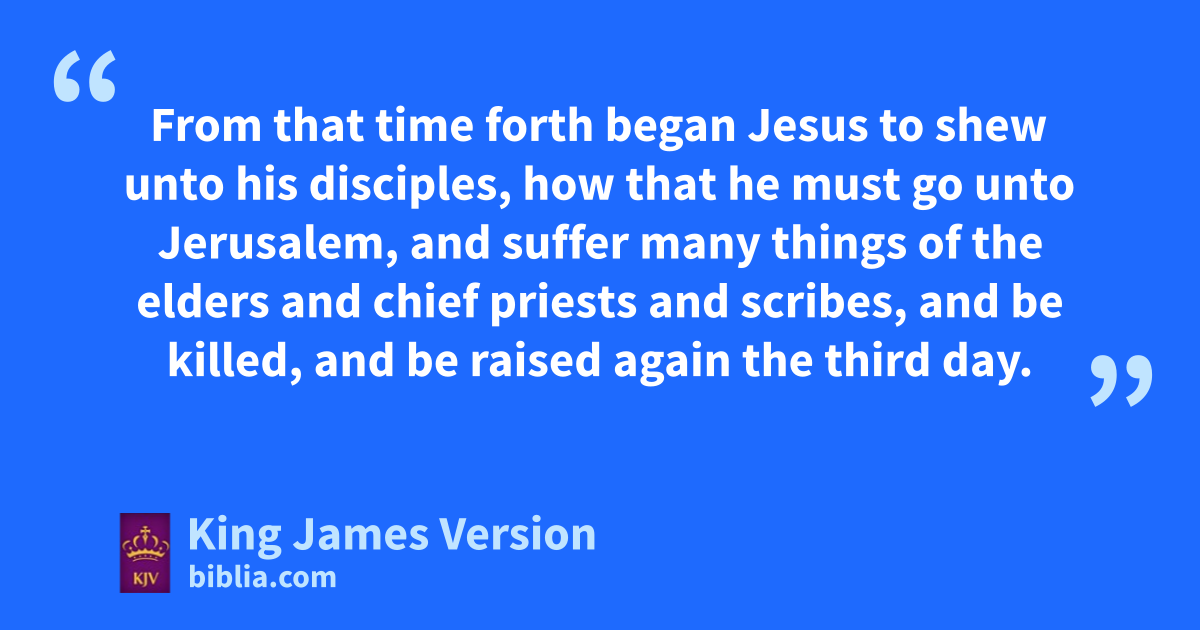21 From that time forth began Jesus gto shew unto his disciples, how that hhe must go unto Jerusalem, and hisuffer many things of the elders and chief priests and scribes, and be killed, and jbe raised again the third day. 22 Then Peter took him, and began to rebuke him, saying, †Be it far from thee, Lord: this shall not be unto thee. 23 But he turned, and said unto Peter, Get thee behind me, kSatan: thou art an loffence unto me: for thou msavourest not the things that be of God, but those that be of men. 24 Then said Jesus unto his disciples, If any man will come after me, let him deny himself, and ntake up his cross, and follow me. 25 For owhosoever will save his life shall lose it: and whosoever will lose his plife for my sake shall find it. 26 For what is a man profited, if he shall gain the whole world, and lose his own psoul? or qwhat shall a man give rin exchange for his psoul? 27 For sthe Son of man shall come in the glory of his Father twith his angels; and then uhe shall reward every man according to his works. 28 Verily I say unto you, There be some standing here, which shall not xtaste of death, ytill they see the Son of man coming in his kingdom.