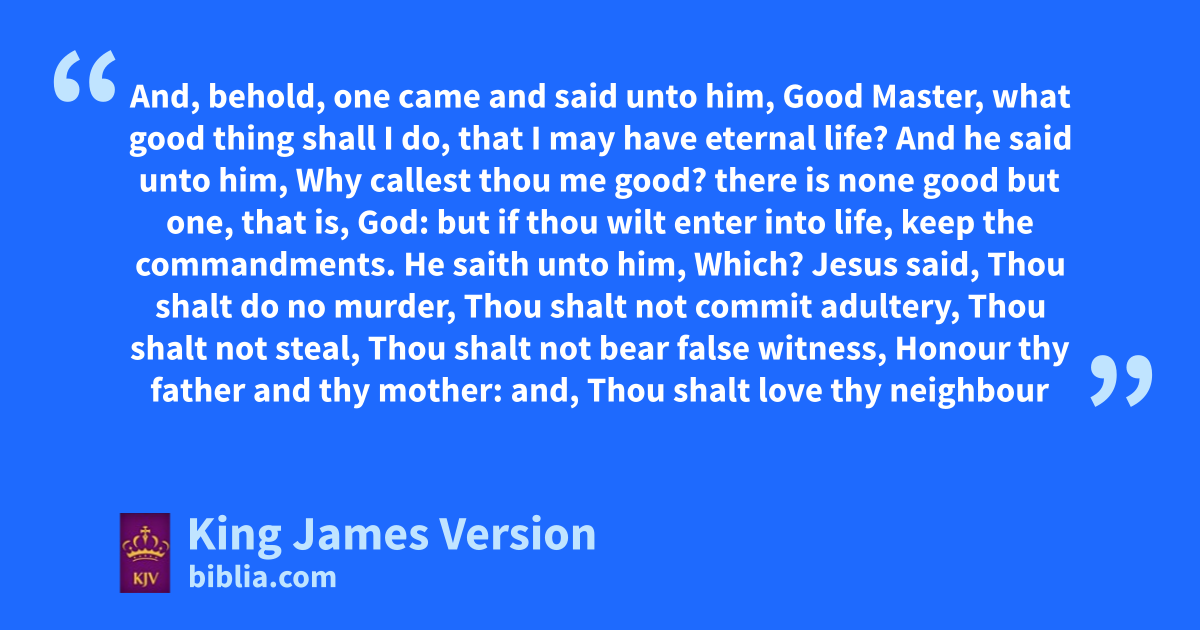 16 And, behold, xone came and said unto him, Good yMaster, what good thing shall I do, that I may have eternal life? 17 And he said unto him, Why callest thou me good? there is none good but one, that is, God: but zif thou wilt enter into life, keep the commandments. 18 He saith unto him, Which? Jesus said, aThou shalt do no murder, Thou shalt not commit adultery, Thou shalt not steal, Thou shalt not bear false witness, 19 bHonour thy father and thy mother: and, cThou shalt love thy neighbour as thyself. 20 The young man saith unto him, All these things have I kept from my youth up: what lack I yet? 21 Jesus said unto him, If thou wilt be dperfect, ego and sell that thou hast, and give to the poor, and fthou shalt have treasure in heaven: and come and follow me. 22 But when the young man heard that saying, he went away sorrowful: for he had great possessions.