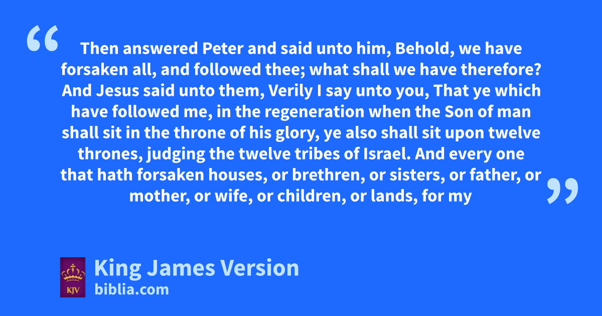 27 Then answered Peter and said unto him, Behold, we have mforsaken all, and followed thee; what shall we have therefore? 28 And Jesus said unto them, Verily I say unto you, That ye which have followed me, in the nregeneration when the Son of man shall sit in the throne of his glory, oye also shall sit upon twelve thrones, opjudging the twelve tribes of Israel. 29 And every one that hath mforsaken houses, or brethren, or sisters, or father, or mother, or wife, or children, or lands, for my name’s sake, shall receive an hundredfold, and shall inherit everlasting life. 30 But many that are qfirst shall be last; and the rlast shall be first.