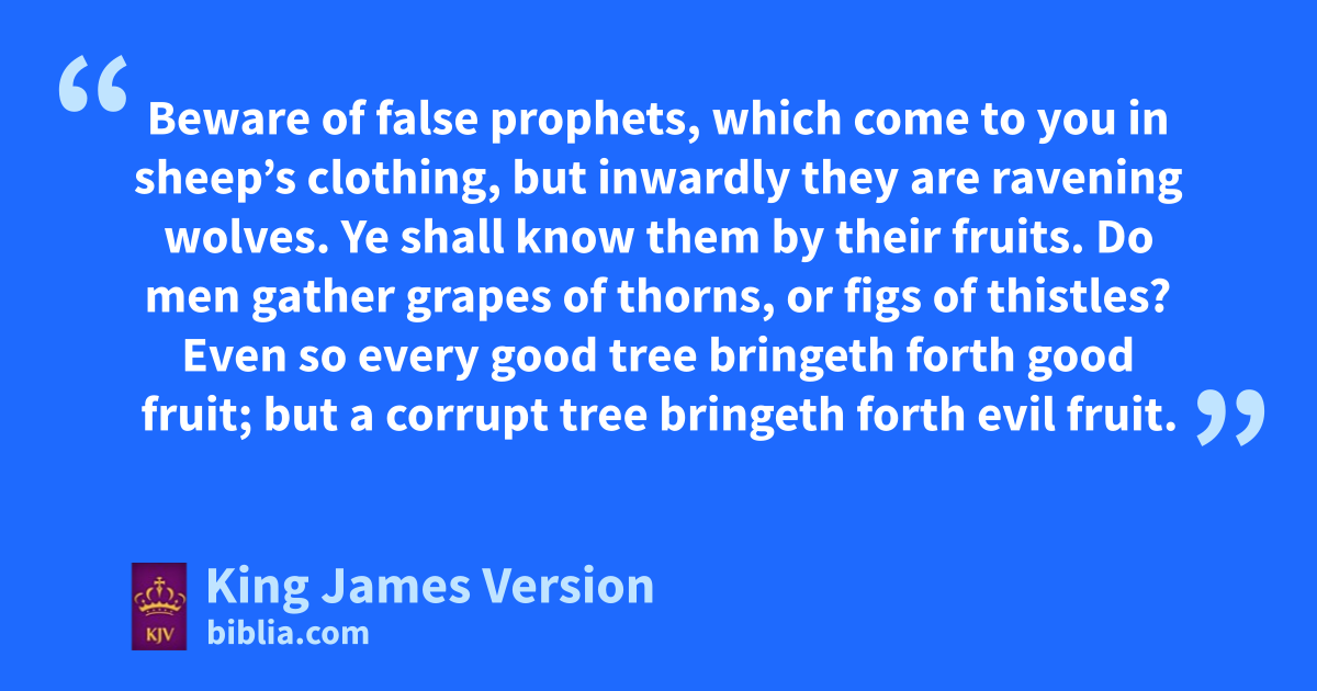 15 nBeware of false prophets, which come to you in sheep’s clothing, but inwardly they are oravening wolves. 16 pYe shall know them by their fruits. Do men gather grapes of thorns, or figs of thistles? 17 Even so every good tree bringeth forth good fruit; but a corrupt tree bringeth forth evil fruit. 18 A good tree cannot bring forth evil fruit, neither can a corrupt tree bring forth good fruit. 19 qEvery tree that bringeth not forth good fruit is hewn down, and cast into the fire. 20 Wherefore pby their fruits ye shall know them.