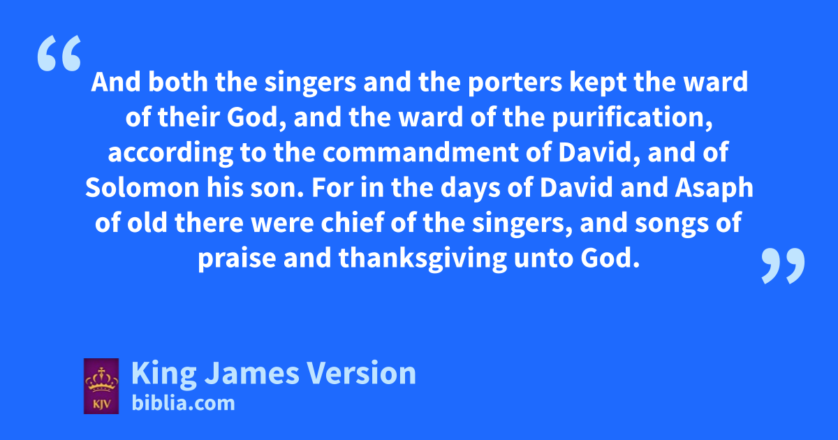44 uAnd at that time were some appointed over the wchambers for the treasures, for the offerings, for the firstfruits, and for the tithes, to gather into them out of the fields of the cities the portions ||of the law for the priests and Levites: †for Judah rejoiced for the priests and for the Levites †that waited. 45 And both the singers and the porters kept the ward of their God, and the ward of the purification, xaccording to the commandment of David, and of Solomon his son. 46 For in the days of David and yAsaph of old there were chief of the singers, and songs of praise and thanksgiving unto God. 47 And all Israel in the days of zZerubbabel, and in the days of Nehemiah, gave the portions of the singers and the porters, aevery day his portion: and bthey ||sanctified holy things unto the Levites; and kthe Levites sanctified them unto the children of Aaron.
