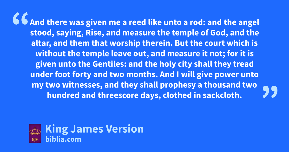 11 And there was given me aa reed like unto a rod: and the angel stood, saying, Rise, and measure the temple of God, and bthe altar, and them that worship therein. 2 But cthe dcourt which is without the temple †leave out, and measure it not; for it is given unto ethe Gentiles: and fthe holy city shall they etread under foot gforty and two months. 3 And ||I will give power unto my two hwitnesses, and hthey shall prophesy gia thousand two hundred and threescore days, kclothed in sackcloth. 4 These are lthe two olive trees, and mthe two candlesticks nstanding before the God of the earth. 5 And if any man will hurt them, ofire proceedeth out of their mouth, and devoureth their enemies: and if any man will hurt them, phe must in this manner be killed. 6 These have power qto shut heaven, that it rain not in the days of their prophecy: and have power over waters rto turn them to blood, and sto smite the earth with all plagues, as often as they will. 7 And when they shall have finished their ttestimony, uthe beast that ascendeth out of vthe bottomless pit wshall make war against them, and wshall overcome them, and kill them. 8 And their xdead bodies shall lie in the street of ythe great city, which spiritually is called zSodom and aEgypt, bwhere also our Lord was crucified. 9 And they of cthe people and kindreds and tongues and nations shall see their xdead bodies three days and an half, and dshall not suffer their xdead bodies to be put in graves. 10 And ethey that dwell upon the earth shall rejoice over them, and make merry, and fshall send gifts one to another; because gthese two prophets htormented ethem that dwelt on the earth. 11 And after ithree days and an half kthe Spirit of life from God entered into them, and lthey stood upon their feet; and great fear fell upon them which saw them. 12 And they heard a great voice from heaven saying unto them, mCome up hither. And nthey ascended up to heaven oin a cloud; and their enemies beheld them. 13 And the same hour pwas there a great earthquake, and qthe tenth part of the city fell, and in the earthquake were slain †of men seven thousand: and the remnant were affrighted, and rgave glory to sthe God of heaven. 14 tThe second woe is past; and, behold, the third woe cometh quickly.
