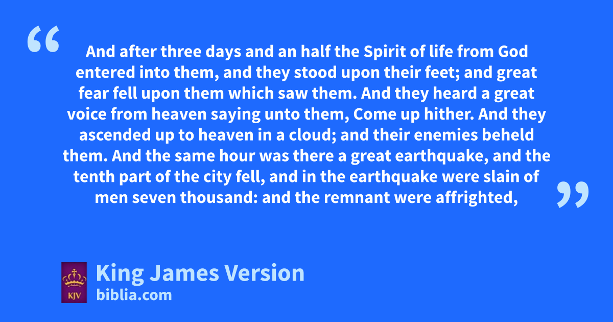 11 And there was given me aa reed like unto a rod: and the angel stood, saying, Rise, and measure the temple of God, and bthe altar, and them that worship therein. 2 But cthe dcourt which is without the temple †leave out, and measure it not; for it is given unto ethe Gentiles: and fthe holy city shall they etread under foot gforty and two months. 3 And ||I will give power unto my two hwitnesses, and hthey shall prophesy gia thousand two hundred and threescore days, kclothed in sackcloth. 4 These are lthe two olive trees, and mthe two candlesticks nstanding before the God of the earth. 5 And if any man will hurt them, ofire proceedeth out of their mouth, and devoureth their enemies: and if any man will hurt them, phe must in this manner be killed. 6 These have power qto shut heaven, that it rain not in the days of their prophecy: and have power over waters rto turn them to blood, and sto smite the earth with all plagues, as often as they will. 7 And when they shall have finished their ttestimony, uthe beast that ascendeth out of vthe bottomless pit wshall make war against them, and wshall overcome them, and kill them. 8 And their xdead bodies shall lie in the street of ythe great city, which spiritually is called zSodom and aEgypt, bwhere also our Lord was crucified. 9 And they of cthe people and kindreds and tongues and nations shall see their xdead bodies three days and an half, and dshall not suffer their xdead bodies to be put in graves. 10 And ethey that dwell upon the earth shall rejoice over them, and make merry, and fshall send gifts one to another; because gthese two prophets htormented ethem that dwelt on the earth. 11 And after ithree days and an half kthe Spirit of life from God entered into them, and lthey stood upon their feet; and great fear fell upon them which saw them. 12 And they heard a great voice from heaven saying unto them, mCome up hither. And nthey ascended up to heaven oin a cloud; and their enemies beheld them. 13 And the same hour pwas there a great earthquake, and qthe tenth part of the city fell, and in the earthquake were slain †of men seven thousand: and the remnant were affrighted, and rgave glory to sthe God of heaven. 14 tThe second woe is past; and, behold, the third woe cometh quickly.