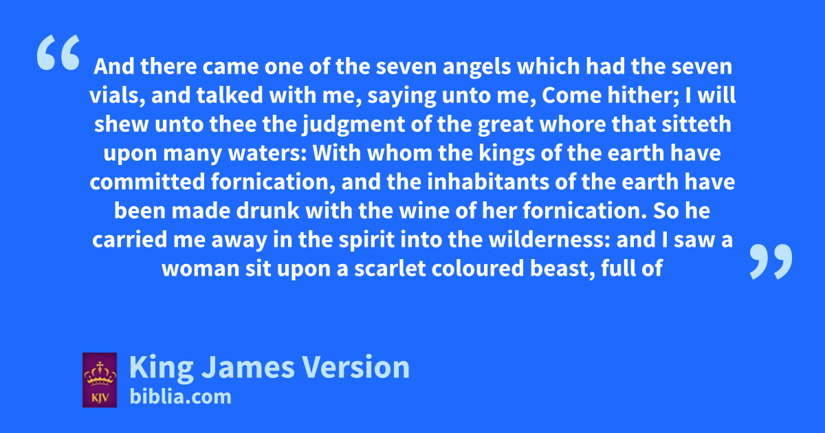 17 And there came aone of aathe seven angels which had the seven vials, and talked with me, saying unto me, aCome hither; bI will shew unto thee the judgment of cthe great whore dthat sitteth upon many waters: 2 eWith whom the kings of the earth have committed fornication, and fthe inhabitants of the earth ghave been hmade drunk with the wine of her fornication. 3 So he carried me away iin the spirit kinto the wilderness: and I saw a woman sit upon a lscarlet coloured beast, full of mnames of blasphemy, mnhaving seven heads and moten horns. 4 And the woman was parrayed in qpurple and lscarlet colour, and †decked rwith gold and rprecious stones and spearls, thaving a golden cup in her hand gfull of abominations and filthiness of her fornication: 5 And upon her forehead was a name written, uMYSTERY, gBABYLON THE GREAT, THE MOTHER OF ||HARLOTS AND vABOMINATIONS OF THE EARTH. 6 And I saw wthe woman hdrunken xwith the blood of the saints, and with the blood of ythe martyrs zof Jesus: and when I saw her, I wondered with great admiration. 7 And the angel said unto me, Wherefore didst thou marvel? I will tell thee uthe mystery of the woman, and of the beast that carrieth her, which hath nthe seven heads and oten horns. 8 The beast that thou sawest awas, and is not; and bshall ascend out of cthe bottomless pit, and dgo into perdition: and ethey that dwell on the earth fshall wonder, gwhose names were not written in the book of life gfrom the foundation of the world, when they behold the beast that was, and is not, and yet is. 9 And hhere is the mind which hath wisdom. iThe seven heads are seven mountains, on which the woman sitteth. 10 And there are seven kings: five are fallen, and one is, and the other is not yet come; and when he cometh, he must continue a short space. 11 And athe beast that was, and is not, even he is the eighth, and is of the seven, and dgoeth into perdition. 12 And ikthe ten horns which thou sawest are ten kings, which have received no kingdom as yet; but receive power as kings lone hour with the beast. 13 These mhave one mind, and shall give their power and strength unto the beast. 14 These nshall make war with the Lamb, and othe Lamb shall overcome them: for he is pqLord of lords, and prKing of kings: and rrthey that are with him are stcalled, and suchosen, and vfaithful. 15 And he saith unto me, wThe waters which thou sawest, where the whore sitteth, are xpeoples, and multitudes, and nations, and tongues. 16 And ythe ten horns which thou sawest upon the beast, zthese shall hate the whore, and ashall make her desolate and bnaked, and bbshall eat her flesh, and cburn her with fire. 17 For God hath dput in their hearts to fulfil his will, and mto agree, and egive their kingdom unto the beast, funtil the words of God shall be fulfilled. 18 And the woman which thou sawest is gthat great city, which reigneth over the kings of the earth.