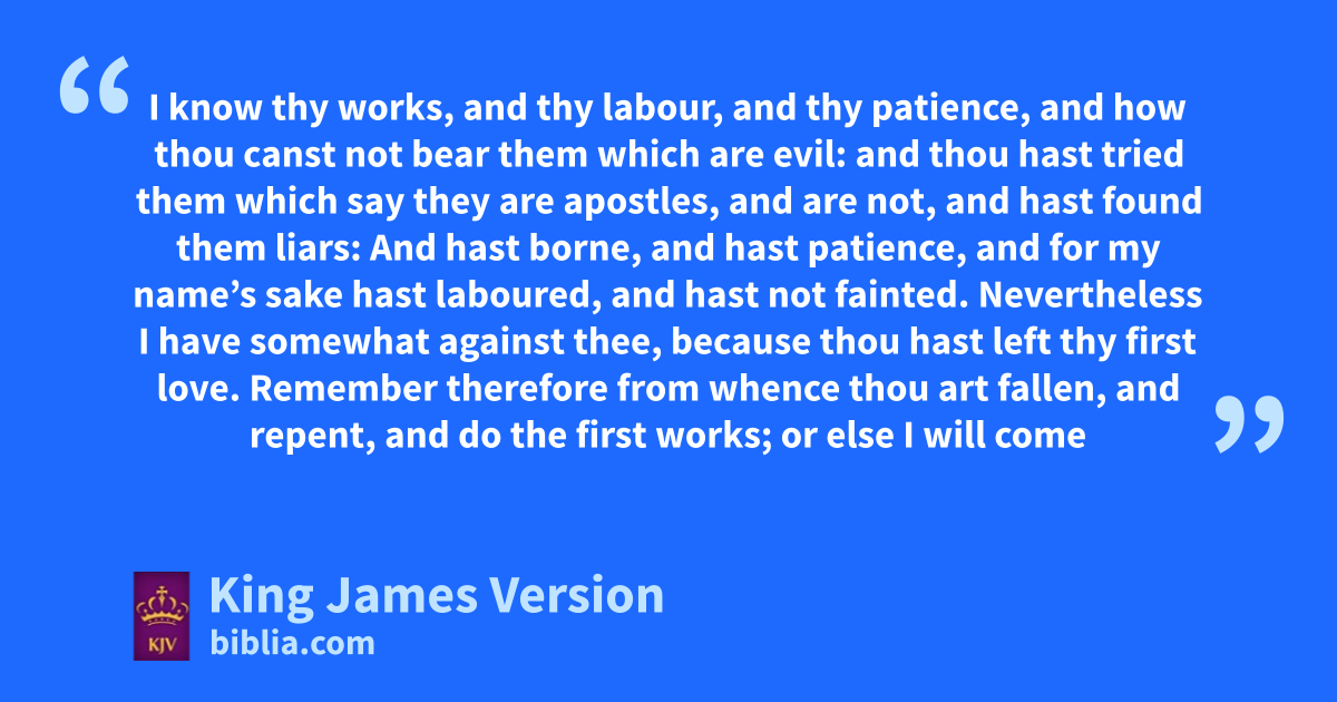 2 Unto athe angel of the church of bEphesus write; These things saith che that holdeth the seven stars in his right hand, who walketh din the midst of the seven golden candlesticks; 2 eI know thy works, and thy labour, and thy patience, and how thou canst not fbear them which are evil: and gthou hast tried them hwhich say they are iapostles, and are not, and hast found them liars: 3 And hast fjborne, and hast patience, and for my name’s sake hast laboured, and khast not fainted. 4 Nevertheless I have somewhat against thee, because thou hast left lthy first love. 5 Remember therefore from whence thou art fallen, and repent, and do the first works; or else mI will come unto thee quickly, and will remove nthy candlestick out of his place, except thou repent. 6 But this thou hast, that thou hatest the deeds of othe Nicolaitans, which I also hate. 7 pHe that hath an ear, let him hear what the Spirit saith unto the churches; qTo him that overcometh will I give to eat of rthe tree of life, which is in the midst of sthe paradise of God.