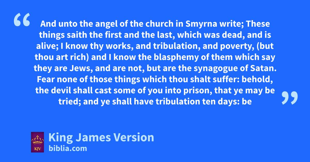 8 And unto athe angel of the church in tSmyrna write; These things saith uthe first and the last, vwhich was dead, and is alive; 9 eI know thy works, and tribulation, and wpoverty, (but thou art wrich) and I know the blasphemy of xythem which say they are Jews, and are not, but are ythe synagogue of zSatan. 10 Fear none of those things which thou shalt suffer: behold, the devil shall cast some of you into prison, that ye may be tried; and aye shall have btribulation cten days: dbe thou efaithful unto death, and I will give thee fa crown of life. 11 gHe that hath an ear, let him hear what the Spirit saith unto the churches; gHe that overcometh hshall not be hurt of ithe second death.