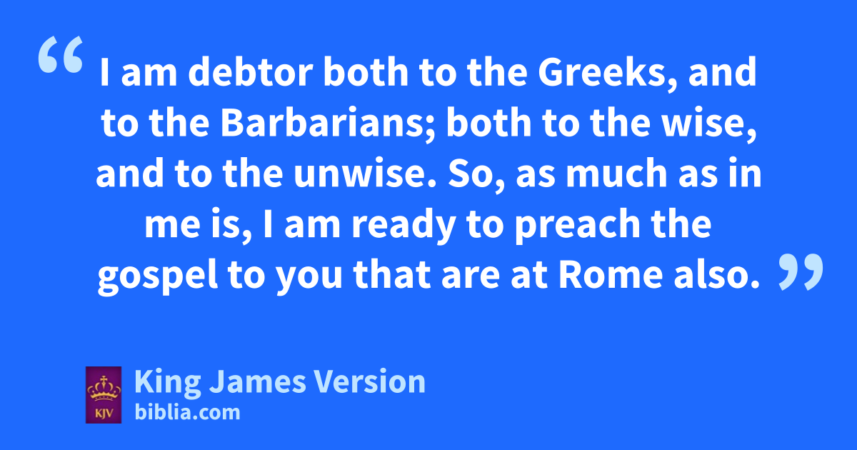 8 First, oI thank my God through Jesus Christ for you all, that pyour faith is spoken of throughout the whole world. 9 For qGod is my witness, rwhom I serve ||with my spirit in the gospel of his Son, that swithout ceasing I make mention of you always in my prayers; 10 tMaking request, if by any means now at length I might uhave a prosperous journey vby the will of God to come unto you. 11 For I long to see you, that wI may impart unto you xsome spiritual gift, to the end you may be established; 12 That is, that I may be comforted together ||with you by ythe mutual faith both of you and me. 13 Now I would not have you ignorant, brethren, that zoftentimes I purposed to come unto you, (but awas let hitherto,) that I might have bsome cfruit ||among you also, even as among other Gentiles. 14 dI am debtor both to the Greeks, and to the eBarbarians; both to the wise, and to the unwise. 15 So, as much as in me is, I am ready to preach the gospel to you that are at Rome also. 16 For fI am not ashamed of the gospel of Christ: for git is the power of God unto salvation to every one that believeth; to hthe Jew ifirst, and also to hthe jGreek. 17 For therein kis the righteousness of God revealed from kkfaith to faith: as it is written, lThe just shall live by faith.