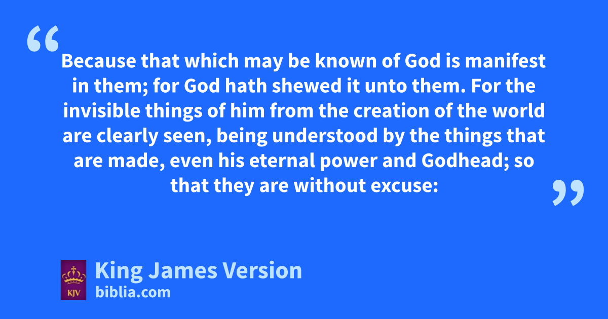 18 For mthe wrath of God is revealed from heaven against all ungodliness and unrighteousness of men, who hold the truth in unrighteousness; 19 nBecause othat which may be known of God is manifest ||in them; for God hath shewed it unto them. 20 For othe invisible things of him from the creation of the world are clearly seen, pbeing understood by the things that are made, even his eternal power and Godhead; ||so that they are qwithout excuse: 21 Because that, when they knew God, they glorified him not as God, neither were thankful; but rbecame svain in their imaginations, and their tfoolish heart swas darkened. 22 uProfessing themselves to be wise, they became fools, 23 And vchanged the glory of the uncorruptible God into wan image made like to corruptible man, and to birds, and wfourfooted beasts, and creeping things. 24 Wherefore xGod also gave them up to uncleanness through the lusts of their own hearts, yto dishonour their own bodies between themselves: 25 Who changed zthe truth of God into aa lie, and worshipped and served the creature ||more than the Creator, who is bblessed for ever. Amen.