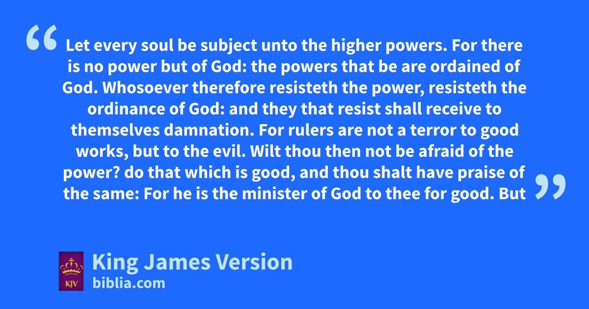 13 Let every asoul bbe subject unto the higher powers. For cthere is no power but of God: the powers that be are ||dordained of God. 2 Whosoever therefore resisteth bthe power, resisteth the ordinance of God: and they that resist shall receive to themselves dddamnation. 3 For rulers are not a terror to egood works, but to the evil. Wilt thou then not be afraid of the power? do that which is good, and fthou shalt have praise of the same: 4 For he is gthe minister of God to thee for good. But if thou do that which is evil, be afraid; for he beareth not the sword in vain: for he is gthe minister of God, a revenger to execute wrath upon him that doeth evil. 5 Wherefore hye must needs be subject, not only for wrath, but also ifor conscience sake. 6 For for this cause pay ye ktribute also: for they are gGod’s ministers, attending continually upon this very thing. 7 lRender therefore to all their dues: ktribute to whom tribute is due; mcustom to whom custom; fear to whom fear; honour to whom honour. 8 Owe no man any thing, but to love one another: for nhe that loveth another hath fulfilled the law. 9 For this, oThou shalt not commit adultery, Thou shalt not kill, Thou shalt not steal, Thou shalt not bear false witness, opThou shalt not covet; and if there be any other commandment, it is briefly comprehended in this saying, namely, qThou shalt love thy neighbour as thyself. 10 Love worketh no ill to his neighbour: therefore nrlove is the fulfilling of the law.