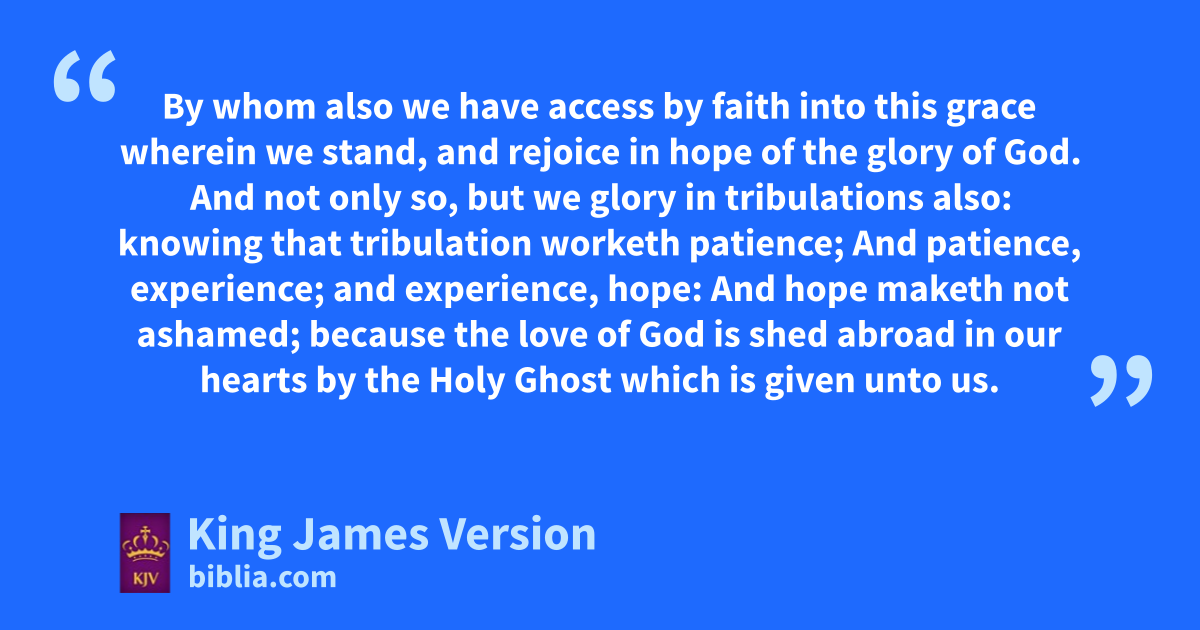 5 Therefore abeing justified by faith, we have bpeace with God through our Lord Jesus Christ: 2 By whom also cwe have access by faith into this grace dwherein we stand, and erejoice in hope of the glory of God. 3 fAnd not only so, but gwe eglory in tribulations also: hknowing that tribulation worketh patience; 4 And patience, iexperience; and iexperience, hope: 5 And jhope maketh not ashamed; because the love of God kis shed abroad in our hearts by the Holy Ghost which is given unto us. 6 For when we were yet without strength, ||in due time lChrist died for the ungodly. 7 For scarcely for a righteous man will one die: yet peradventure for a good man some would even dare to die. 8 But God mcommendeth nhis love toward us, in that, owhile we were yet sinners, lChrist died for us. 9 Much more then, being now justified oby his blood, pwe shall be saved from wrath through him. 10 For if, qwhen we were enemies, rwe were reconciled to God by the death of his Son, much more, being reconciled, we shall be saved by shis life. 11 fAnd not only so, but we also ejoy in God through our Lord Jesus Christ, by whom we have now received the ||atonement.