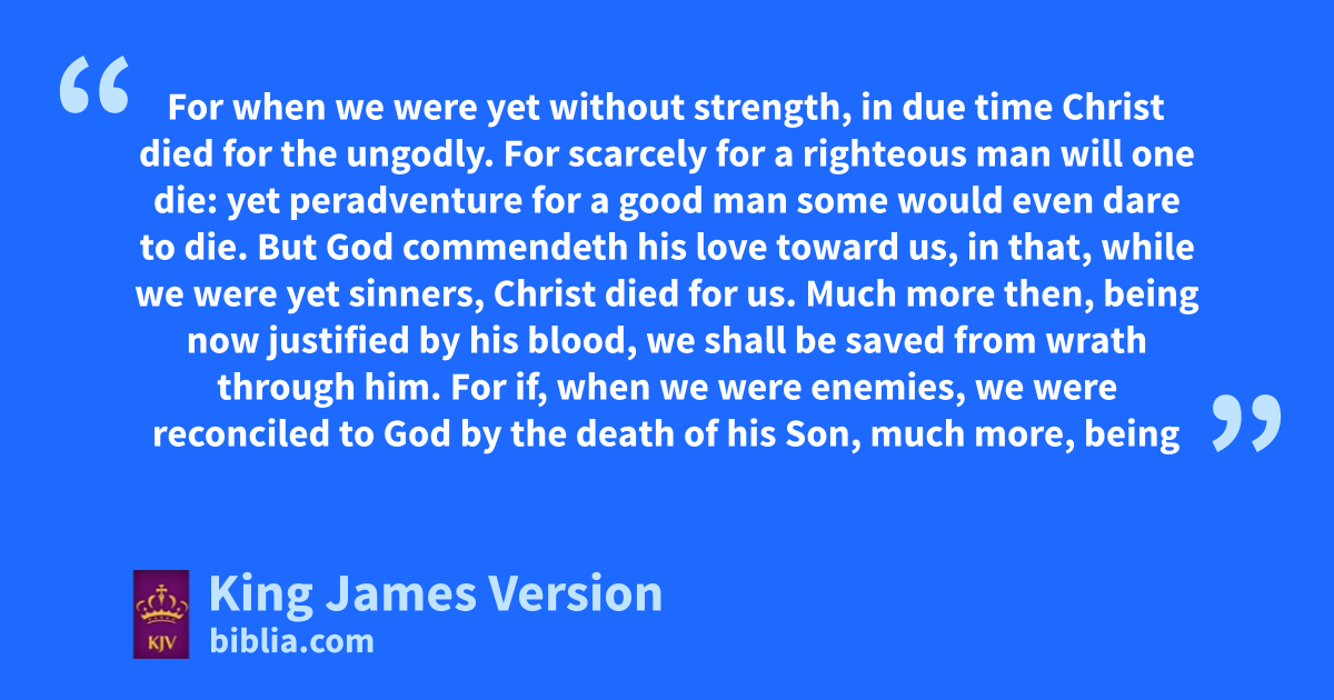 5 Therefore abeing justified by faith, we have bpeace with God through our Lord Jesus Christ: 2 By whom also cwe have access by faith into this grace dwherein we stand, and erejoice in hope of the glory of God. 3 fAnd not only so, but gwe eglory in tribulations also: hknowing that tribulation worketh patience; 4 And patience, iexperience; and iexperience, hope: 5 And jhope maketh not ashamed; because the love of God kis shed abroad in our hearts by the Holy Ghost which is given unto us. 6 For when we were yet without strength, ||in due time lChrist died for the ungodly. 7 For scarcely for a righteous man will one die: yet peradventure for a good man some would even dare to die. 8 But God mcommendeth nhis love toward us, in that, owhile we were yet sinners, lChrist died for us. 9 Much more then, being now justified oby his blood, pwe shall be saved from wrath through him. 10 For if, qwhen we were enemies, rwe were reconciled to God by the death of his Son, much more, being reconciled, we shall be saved by shis life. 11 fAnd not only so, but we also ejoy in God through our Lord Jesus Christ, by whom we have now received the ||atonement.