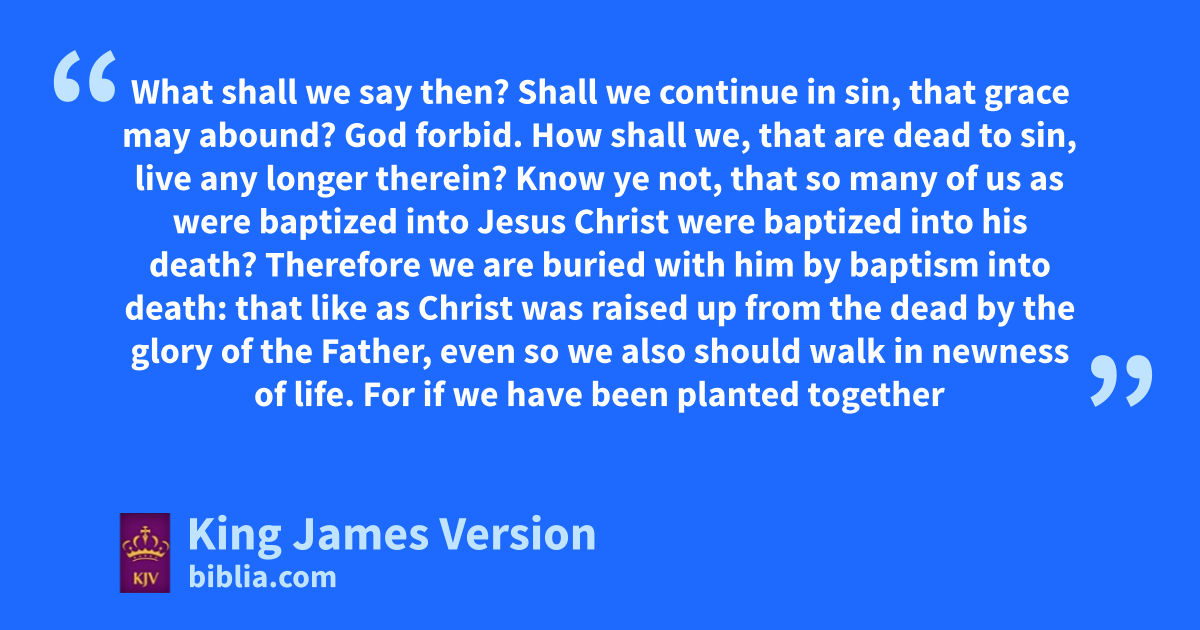 6 What shall we say then? aShall we continue in sin, that bgrace may abound? 2 cGod forbid. How shall we, that dare dead to sin, live any longer therein? 3 Know ye not, that eso many of us as ||were baptized finto Jesus Christ ||were gbaptized into his death? 4 Therefore we are hburied with him by baptism into death: that like as iChrist was raised up from the dead by kthe glory of the Father, even so lwe also should walk in newness of life. 5 For mif we have been nplanted together in the likeness of his death, we shall be also in the likeness of his resurrection: 6 Knowing this, that oour old man pis crucified with him, that qthe body of sin might be destroyed, that henceforth we should not serve sin. 7 For rhe that is dead is †sfreed from sin. 8 Now tif we be dead with Christ, we believe that we shall also live with him: 9 Knowing that uChrist being raised from the dead dieth no more; death hath no more dominion over him. 10 For in that he died, whe died unto sin xonce: but in that he liveth, he yliveth unto God. 11 Likewise reckon ye also yourselves to be zdead indeed unto sin, but alive aunto God through Jesus Christ our Lord. 12 Let not bsin therefore reign in your mortal body, that ye should obey it in the lusts thereof. 13 Neither cyield ye your members as †instruments of unrighteousness unto sin: but dyield yourselves unto God, as those that are alive from the dead, and your members as †instruments of righteousness unto God. 14 For bsin shall not have dominion over you: for eye are not under the law, but under grace.