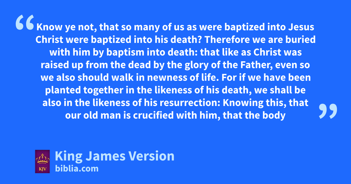 6 What shall we say then? aShall we continue in sin, that bgrace may abound? 2 cGod forbid. How shall we, that dare dead to sin, live any longer therein? 3 Know ye not, that eso many of us as ||were baptized finto Jesus Christ ||were gbaptized into his death? 4 Therefore we are hburied with him by baptism into death: that like as iChrist was raised up from the dead by kthe glory of the Father, even so lwe also should walk in newness of life. 5 For mif we have been nplanted together in the likeness of his death, we shall be also in the likeness of his resurrection: 6 Knowing this, that oour old man pis crucified with him, that qthe body of sin might be destroyed, that henceforth we should not serve sin. 7 For rhe that is dead is †sfreed from sin. 8 Now tif we be dead with Christ, we believe that we shall also live with him: 9 Knowing that uChrist being raised from the dead dieth no more; death hath no more dominion over him. 10 For in that he died, whe died unto sin xonce: but in that he liveth, he yliveth unto God. 11 Likewise reckon ye also yourselves to be zdead indeed unto sin, but alive aunto God through Jesus Christ our Lord. 12 Let not bsin therefore reign in your mortal body, that ye should obey it in the lusts thereof. 13 Neither cyield ye your members as †instruments of unrighteousness unto sin: but dyield yourselves unto God, as those that are alive from the dead, and your members as †instruments of righteousness unto God. 14 For bsin shall not have dominion over you: for eye are not under the law, but under grace.