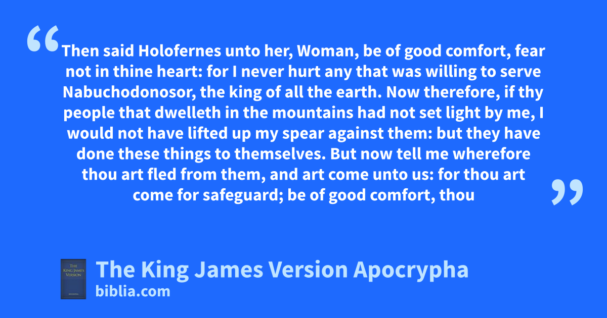 1 Then said Holofernes unto her, Woman, be of good comfort, fear not in thine heart: for I never hurt any that was willing to serve Nabuchodonosor, the king of all the earth. 2 Now therefore, if thy people that dwelleth in the mountains had not set light by me, I would not have lifted up my spear against them: but they have done these things to themselves. 3 But now tell me wherefore thou art fled from them, and art come unto us: for thou art come for safeguard; be of good comfort, thou shalt live this night, and hereafter: 4 For none shall hurt thee, but entreat thee well, as they do the servants of king Nabuchodonosor my lord.