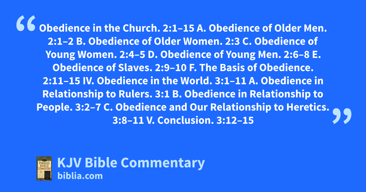 Obedience in the Church. 2:1–15 A. Obedience of Older Men. 2:1–2 B. Obedience of Older Women. 2:3 C. Obedience of Young Women. 2:4–5 D. Obedience of Young Men. 2:6–8 E. Obedience of Slaves. 2:9–10 F. The Basis of Obedience. 2:11–15 IV. Obedience in the World. 3:1–11 A. Obedience in Relationship to Rulers. 3:1 B. Obedience in Relationship to People. 3:2–7 C. Obedience and Our Relationship to Heretics. 3:8–11 V. Conclusion. 3:12–15