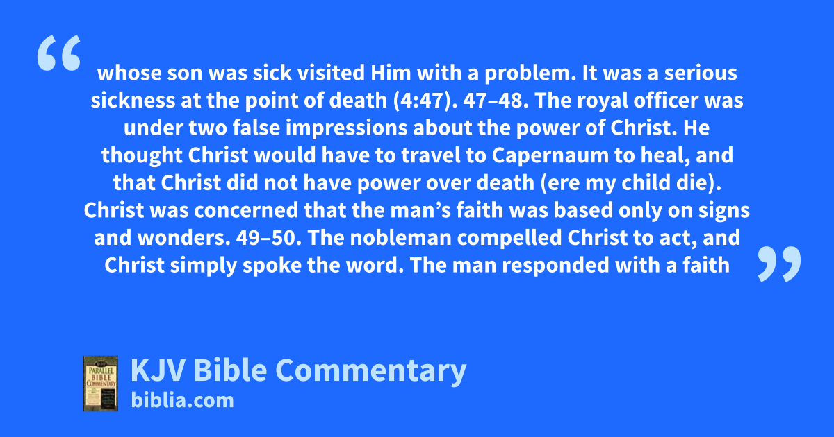 whose son was sick visited Him with a problem. It was a serious sickness at the point of death (4:47). 47–48. The royal officer was under two false impressions about the power of Christ. He thought Christ would have to travel to Capernaum to heal, and that Christ did not have power over death (ere my child die). Christ was concerned that the man’s faith was based only on signs and wonders. 49–50. The nobleman compelled Christ to act, and Christ simply spoke the word. The man responded with a faith