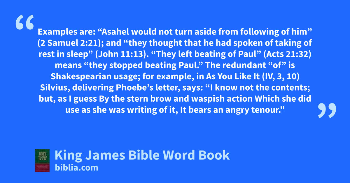 Examples are: “Asahel would not turn aside from following of him” (2 Samuel 2:21); and “they thought that he had spoken of taking of rest in sleep” (John 11:13). “They left beating of Paul” (Acts 21:32) means “they stopped beating Paul.” The redundant “of” is Shakespearian usage; for example, in As You Like It (IV, 3, 10) Silvius, delivering Phoebe’s letter, says: “I know not the contents; but, as I guess By the stern brow and waspish action Which she did use as she was writing of it, It bears an angry tenour.”