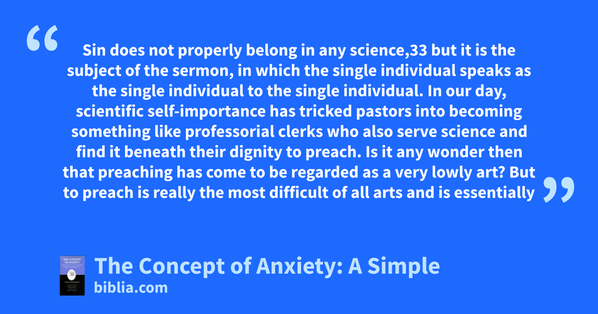 Sin does not properly belong in any science,33 but it is the subject of the sermon, in which the single individual speaks as the single individual to the single individual. In our day, scientific self-importance has tricked pastors into becoming something like professorial clerks who also serve science and find it beneath their dignity to preach. Is it any wonder then that preaching has come to be regarded as a very lowly art? But to preach is really the most difficult of all arts and is essentially