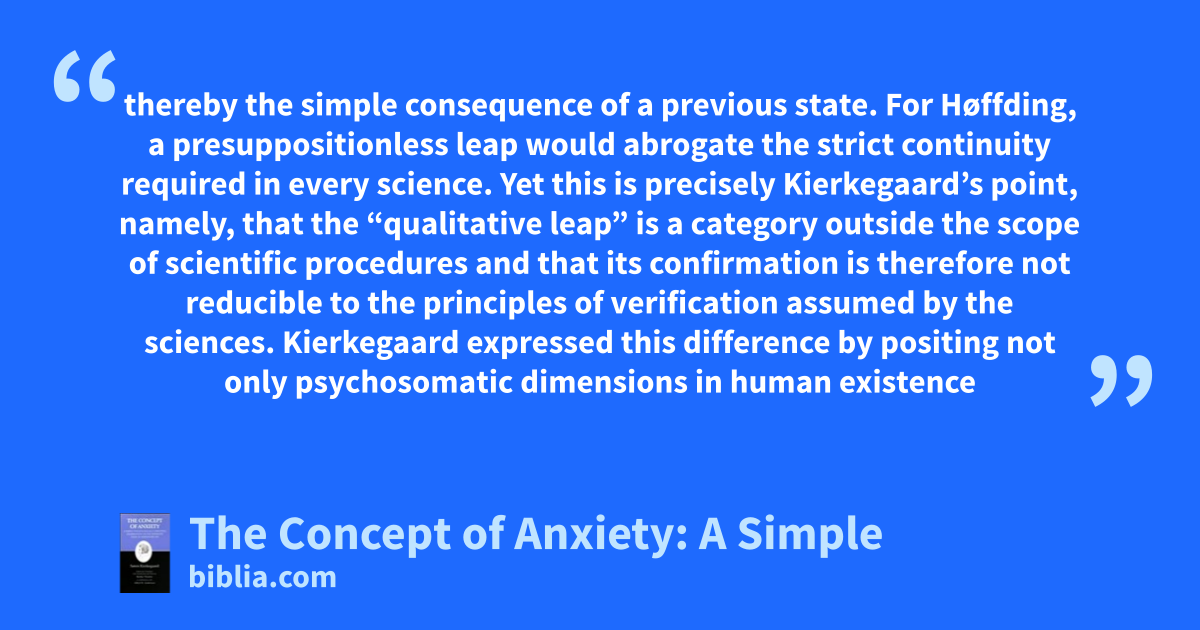 thereby the simple consequence of a previous state. For Høffding, a presuppositionless leap would abrogate the strict continuity required in every science. Yet this is precisely Kierkegaard’s point, namely, that the “qualitative leap” is a category outside the scope of scientific procedures and that its confirmation is therefore not reducible to the principles of verification assumed by the sciences. Kierkegaard expressed this difference by positing not only psychosomatic dimensions in human existence