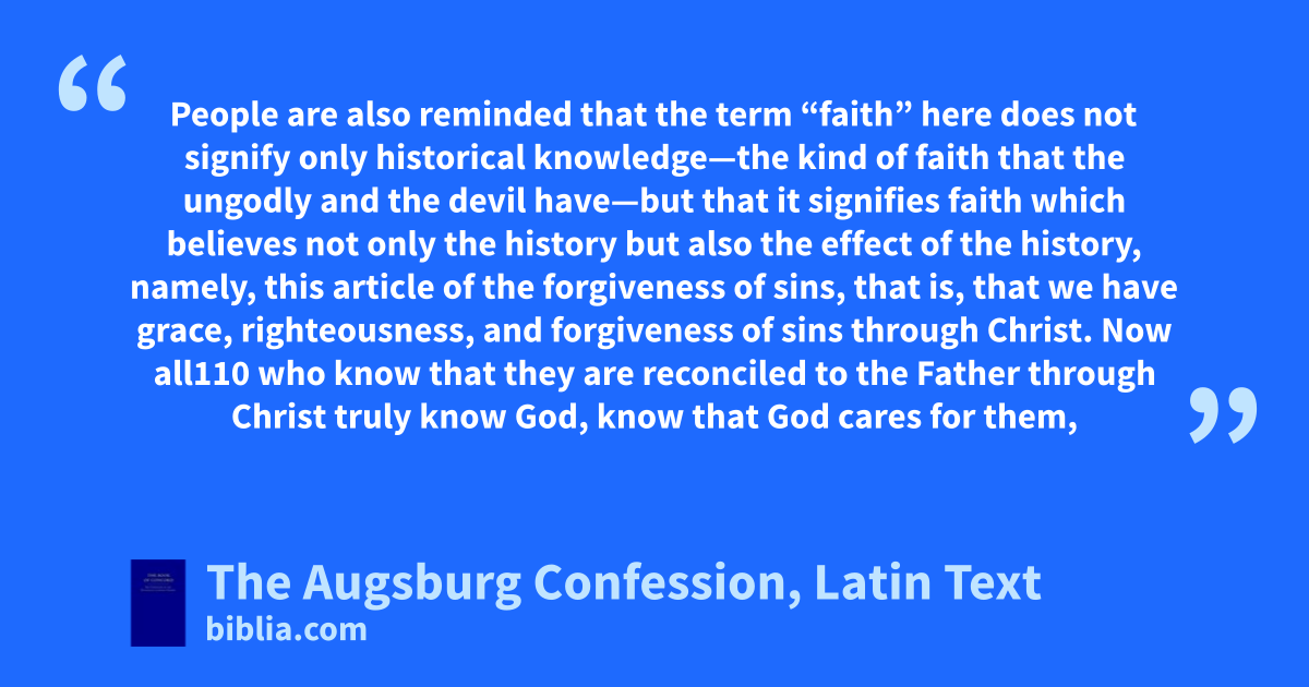People are also reminded that the term “faith” here does not signify only historical knowledge—the kind of faith that the ungodly and the devil have—but that it signifies faith which believes not only the history but also the effect of the history, namely, this article of the forgiveness of sins, that is, that we have grace, righteousness, and forgiveness of sins through Christ. Now all110 who know that they are reconciled to the Father through Christ truly know God, know that God cares for them,