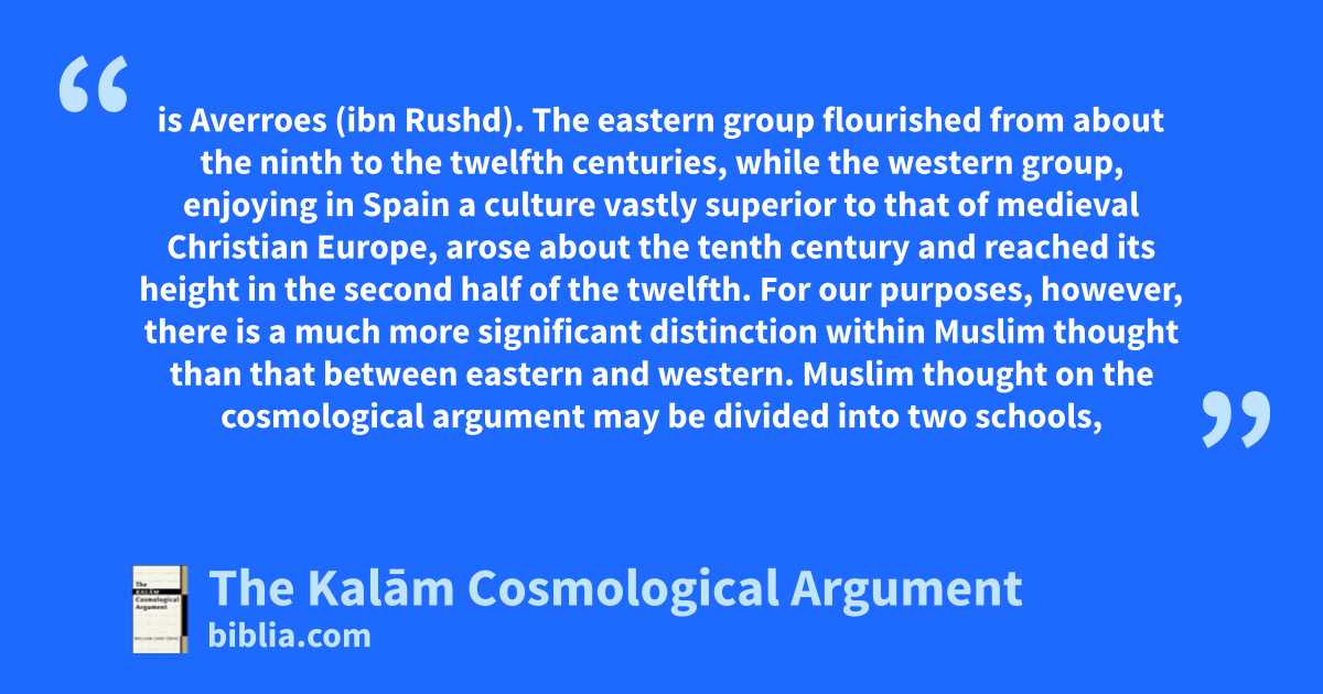 is Averroes (ibn Rushd). The eastern group flourished from about the ninth to the twelfth centuries, while the western group, enjoying in Spain a culture vastly superior to that of medieval Christian Europe, arose about the tenth century and reached its height in the second half of the twelfth. For our purposes, however, there is a much more significant distinction within Muslim thought than that between eastern and western. Muslim thought on the cosmological argument may be divided into two schools,