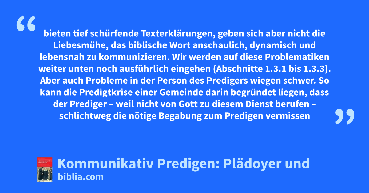 bieten tief schürfende Texterklärungen, geben sich aber nicht die Liebesmühe, das biblische Wort anschaulich, dynamisch und lebensnah zu kommunizieren. Wir werden auf diese Problematiken weiter unten noch ausführlich eingehen (Abschnitte 1.3.1 bis 1.3.3). Aber auch Probleme in der Person des Predigers wiegen schwer. So kann die Predigtkrise einer Gemeinde darin begründet liegen, dass der Prediger – weil nicht von Gott zu diesem Dienst berufen – schlichtweg die nötige Begabung zum Predigen vermissen