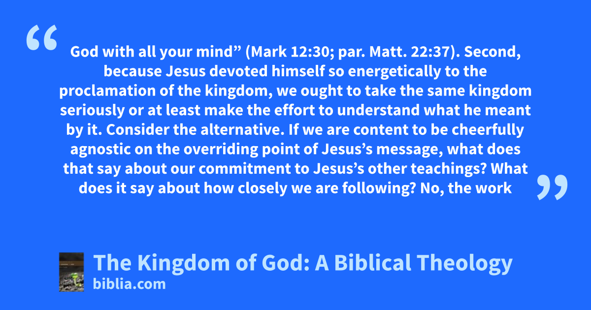 God with all your mind” (Mark 12:30; par. Matt. 22:37). Second, because Jesus devoted himself so energetically to the proclamation of the kingdom, we ought to take the same kingdom seriously or at least make the effort to understand what he meant by it. Consider the alternative. If we are content to be cheerfully agnostic on the overriding point of Jesus’s message, what does that say about our commitment to Jesus’s other teachings? What does it say about how closely we are following? No, the work
