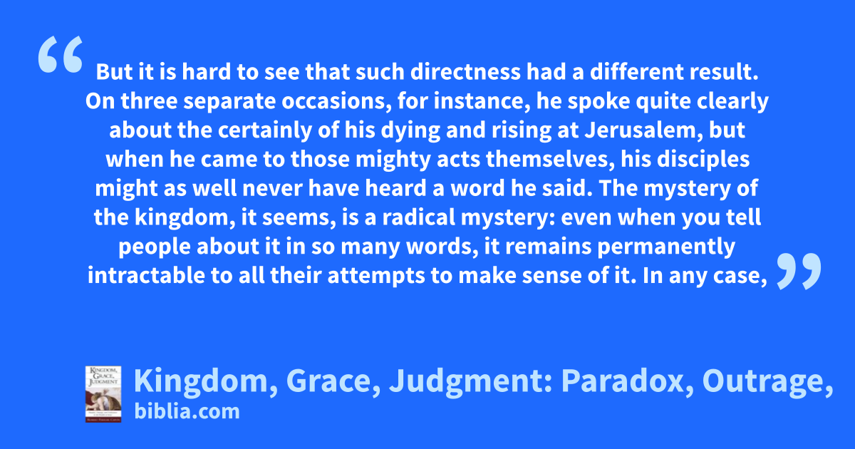 But it is hard to see that such directness had a different result. On three separate occasions, for instance, he spoke quite clearly about the certainly of his dying and rising at Jerusalem, but when he came to those mighty acts themselves, his disciples might as well never have heard a word he said. The mystery of the kingdom, it seems, is a radical mystery: even when you tell people about it in so many words, it remains permanently intractable to all their attempts to make sense of it. In any case,