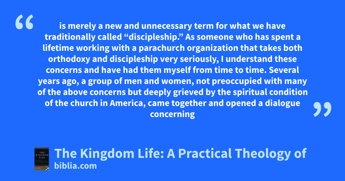is merely a new and unnecessary term for what we have traditionally called “discipleship.” As someone who has spent a lifetime working with a parachurch organization that takes both orthodoxy and discipleship very seriously, I understand these concerns and have had them myself from time to time. Several years ago, a group of men and women, not preoccupied with many of the above concerns but deeply grieved by the spiritual condition of the church in America, came together and opened a dialogue concerning