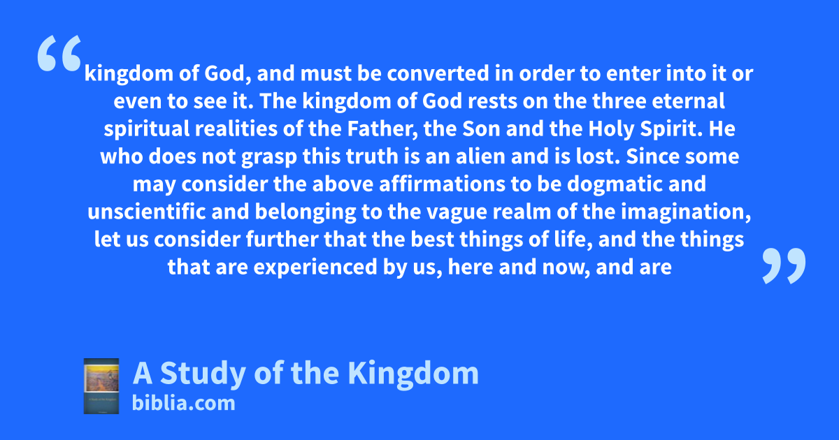 kingdom of God, and must be converted in order to enter into it or even to see it. The kingdom of God rests on the three eternal spiritual realities of the Father, the Son and the Holy Spirit. He who does not grasp this truth is an alien and is lost. Since some may consider the above affirmations to be dogmatic and unscientific and belonging to the vague realm of the imagination, let us consider further that the best things of life, and the things that are experienced by us, here and now, and are