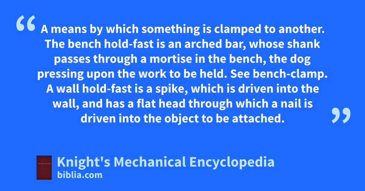 A means by which something is clamped to another. The bench hold-fast is an arched bar, whose shank passes through a mortise in the bench, the dog pressing upon the work to be held. See bench-clamp. A wall hold-fast is a spike, which is driven into the wall, and has a flat head through which a nail is driven into the object to be attached.