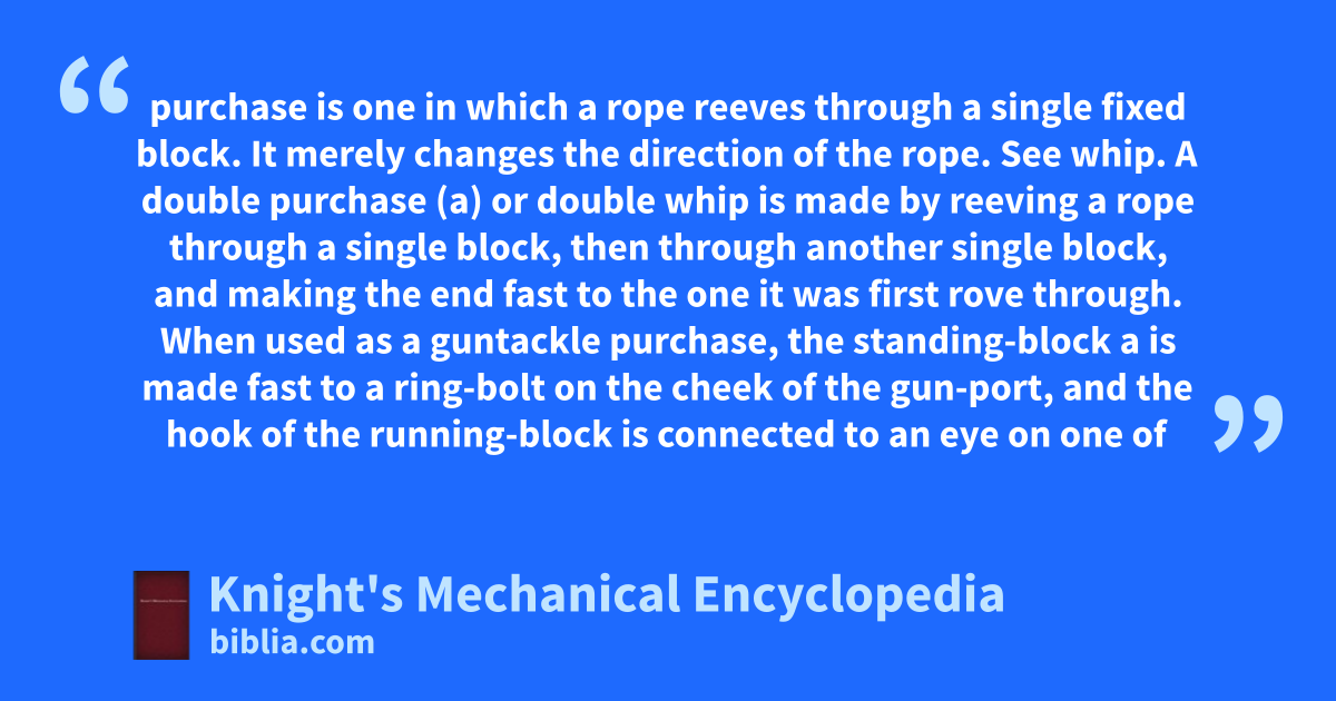 purchase is one in which a rope reeves through a single fixed block. It merely changes the direction of the rope. See whip. A double purchase (a) or double whip is made by reeving a rope through a single block, then through another single block, and making the end fast to the one it was first rove through. When used as a guntackle purchase, the standing-block a is made fast to a ring-bolt on the cheek of the gun-port, and the hook of the running-block is connected to an eye on one of