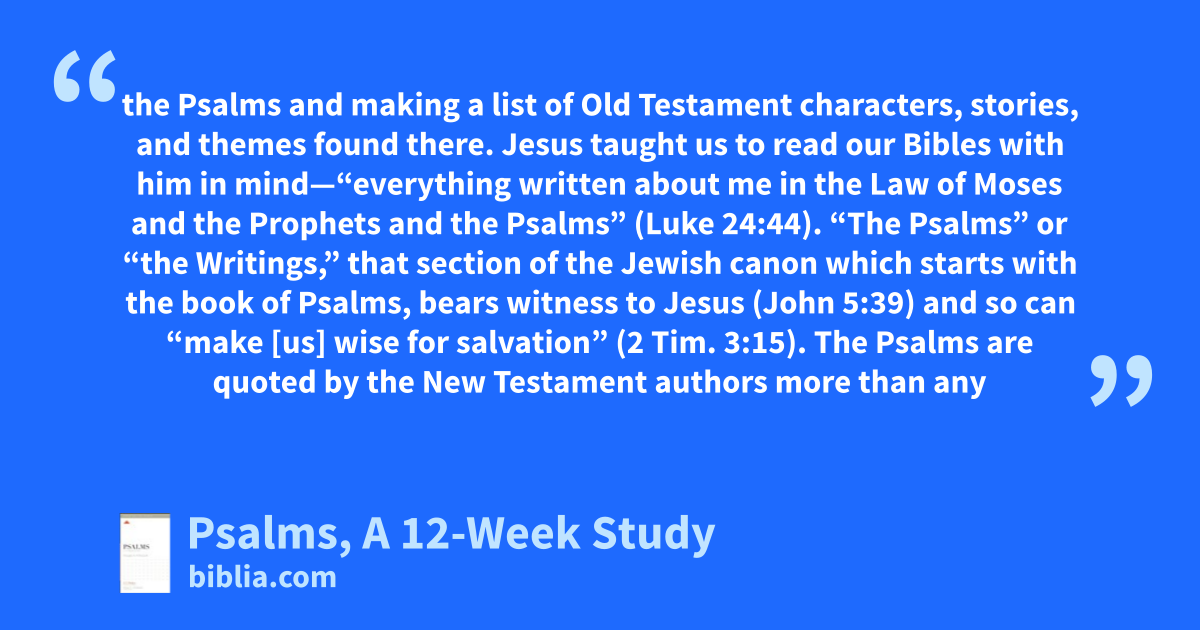 the Psalms and making a list of Old Testament characters, stories, and themes found there. Jesus taught us to read our Bibles with him in mind—“everything written about me in the Law of Moses and the Prophets and the Psalms” (Luke 24:44). “The Psalms” or “the Writings,” that section of the Jewish canon which starts with the book of Psalms, bears witness to Jesus (John 5:39) and so can “make [us] wise for salvation” (2 Tim. 3:15). The Psalms are quoted by the New Testament authors more than any