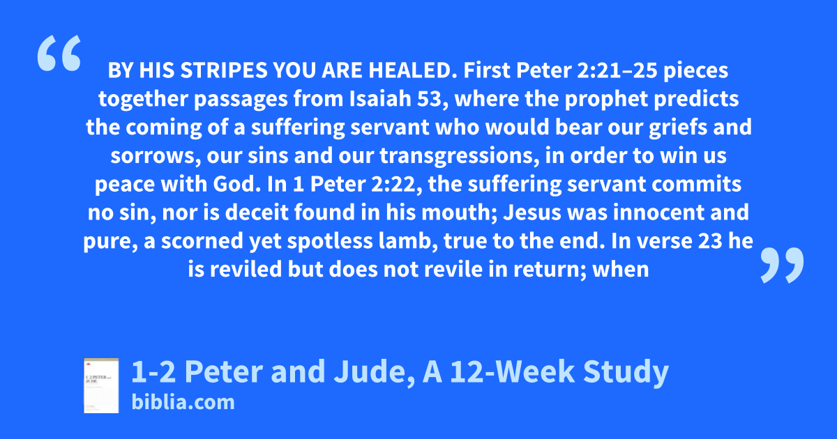 BY HIS STRIPES YOU ARE HEALED. First Peter 2:21–25 pieces together passages from Isaiah 53, where the prophet predicts the coming of a suffering servant who would bear our griefs and sorrows, our sins and our transgressions, in order to win us peace with God. In 1 Peter 2:22, the suffering servant commits no sin, nor is deceit found in his mouth; Jesus was innocent and pure, a scorned yet spotless lamb, true to the end. In verse 23 he is reviled but does not revile in return; when