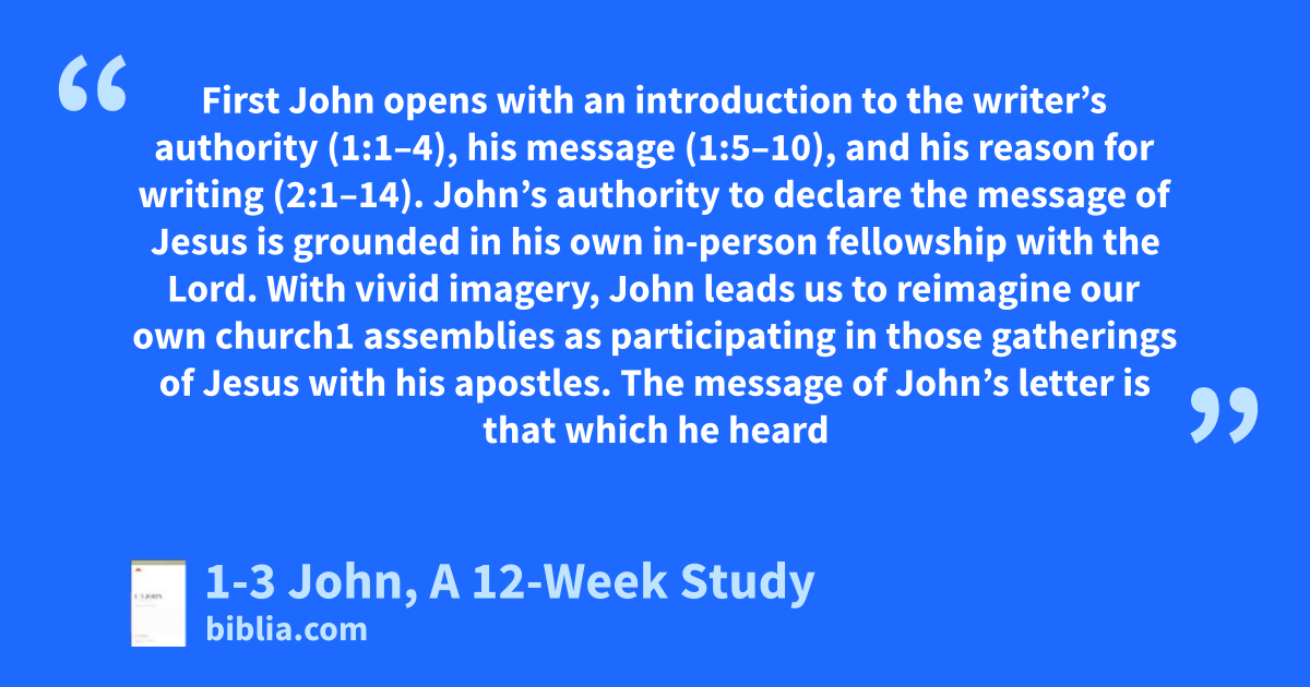 First John opens with an introduction to the writer’s authority (1:1–4), his message (1:5–10), and his reason for writing (2:1–14). John’s authority to declare the message of Jesus is grounded in his own in-person fellowship with the Lord. With vivid imagery, John leads us to reimagine our own church1 assemblies as participating in those gatherings of Jesus with his apostles. The message of John’s letter is that which he heard