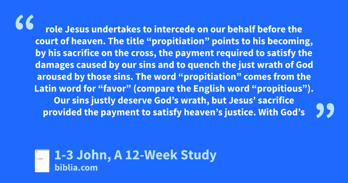 role Jesus undertakes to intercede on our behalf before the court of heaven. The title “propitiation” points to his becoming, by his sacrifice on the cross, the payment required to satisfy the damages caused by our sins and to quench the just wrath of God aroused by those sins. The word “propitiation” comes from the Latin word for “favor” (compare the English word “propitious”). Our sins justly deserve God’s wrath, but Jesus’ sacrifice provided the payment to satisfy heaven’s justice. With God’s