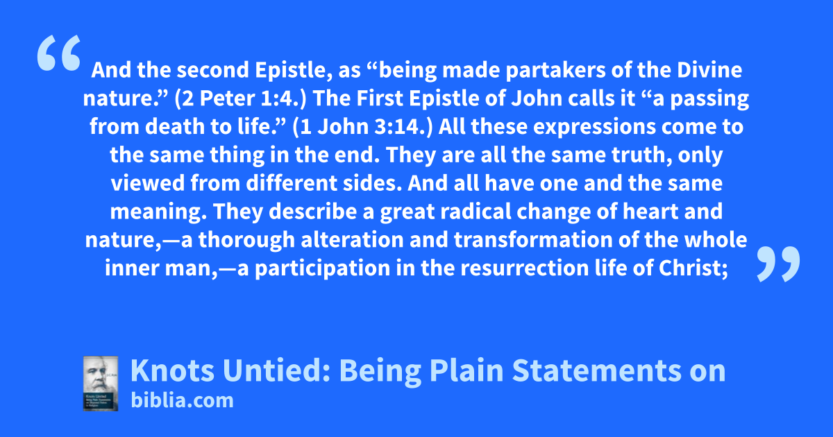 And the second Epistle, as “being made partakers of the Divine nature.” (2 Peter 1:4.) The First Epistle of John calls it “a passing from death to life.” (1 John 3:14.) All these expressions come to the same thing in the end. They are all the same truth, only viewed from different sides. And all have one and the same meaning. They describe a great radical change of heart and nature,—a thorough alteration and transformation of the whole inner man,—a participation in the resurrection life of Christ;