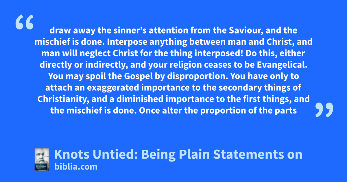 draw away the sinner’s attention from the Saviour, and the mischief is done. Interpose anything between man and Christ, and man will neglect Christ for the thing interposed! Do this, either directly or indirectly, and your religion ceases to be Evangelical. You may spoil the Gospel by disproportion. You have only to attach an exaggerated importance to the secondary things of Christianity, and a diminished importance to the first things, and the mischief is done. Once alter the proportion of the parts