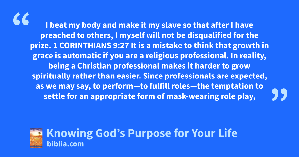 I beat my body and make it my slave so that after I have preached to others, I myself will not be disqualified for the prize. 1 CORINTHIANS 9:27 It is a mistake to think that growth in grace is automatic if you are a religious professional. In reality, being a Christian professional makes it harder to grow spiritually rather than easier. Since professionals are expected, as we may say, to perform—to fulfill roles—the temptation to settle for an appropriate form of mask-wearing role play,