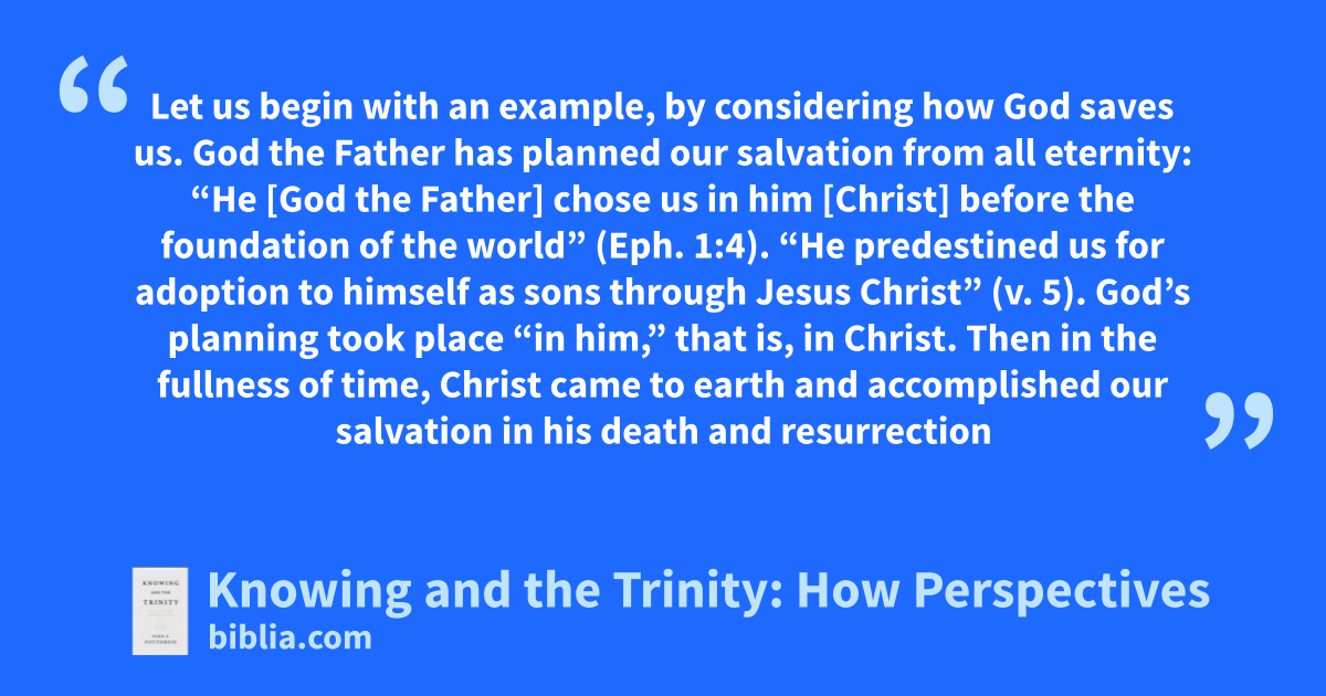 Let us begin with an example, by considering how God saves us. God the Father has planned our salvation from all eternity: “He [God the Father] chose us in him [Christ] before the foundation of the world” (Eph. 1:4). “He predestined us for adoption to himself as sons through Jesus Christ” (v. 5). God’s planning took place “in him,” that is, in Christ. Then in the fullness of time, Christ came to earth and accomplished our salvation in his death and resurrection