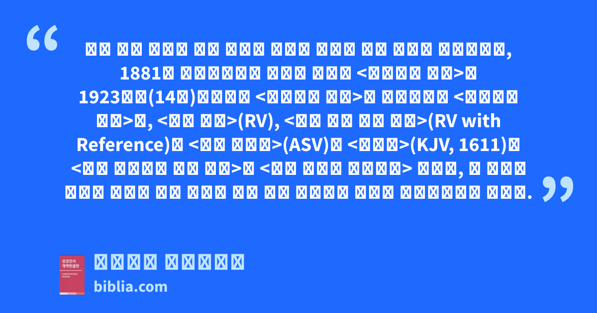 About 성경전서 개역한글판현재 한국 교회에서 두루 읽고 있는 성경으로, 1911년에 번역 출간된 「셩경젼셔」를 두 차례에 걸쳐서 크게 개정한 것이다. 1차로 개역된 성경은 1938년에 출간된 「셩경 개역」이다. 1938년의 「개역」과 구별하여 1911년의 「셩경젼셔」를 「옛 번역」 또는 「구역」이라고 부른다. 이것을 '한글맞춤법통일안'에 따라 표기를 고치고 더 손질하여 출판한 첫 판이 1952년에 나온 「성경전서 개역한글판」이다. '한글판'이라는 이름은 '국한문판'과 구별하려고 쓴 것이 아니라, 성경의 표기를 「셩경 개역」에서 쓰던 옛 철자법을 버리고, 한글맞춤법통일안의 철자법에 따랐다는 뜻으로 쓴 것이다. 그 후 번역 내용과 표기법을 더 손질하여 출간한 개정의 결정판이 1961년에 나온 「성경전서 개역 한글판」(표제지 연도 1956)이다. 구약은 1911년부터 1937년까지 26년 동안 개역 작업을 하였고, 신약은 1926년에 시작하여 1937년에 끝마쳐 12년 만에 마무리되었다. |