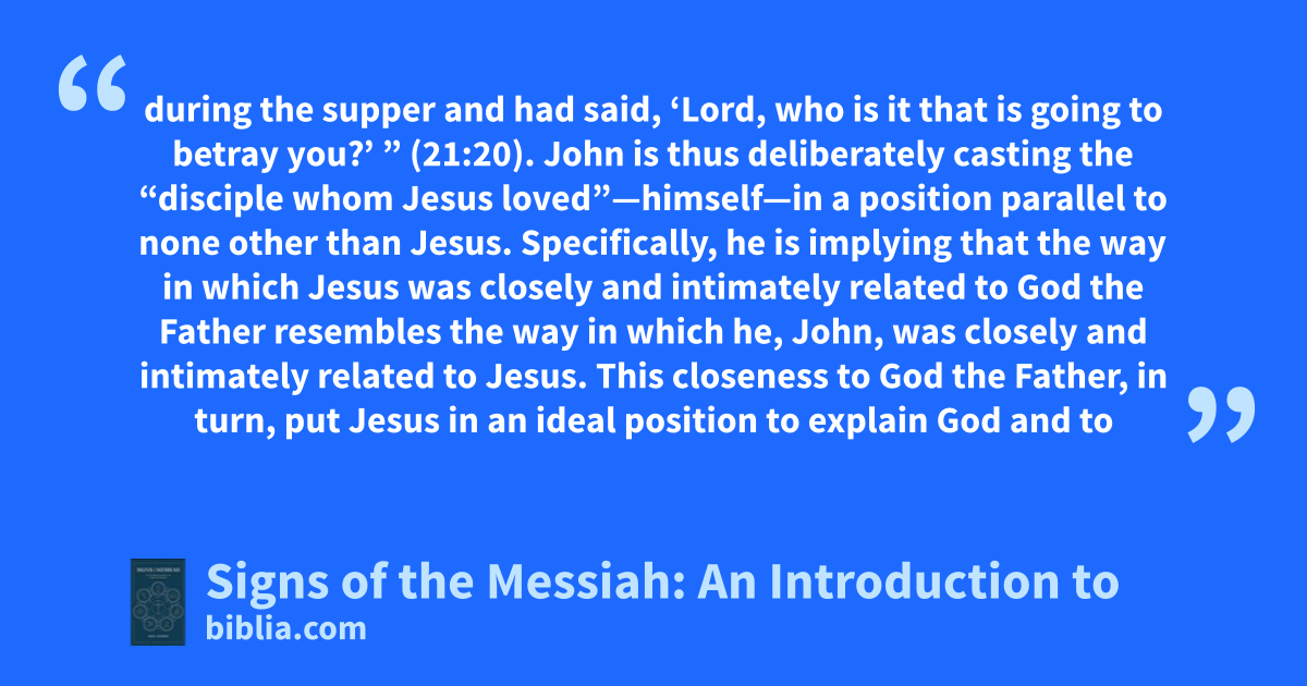 during the supper and had said, ‘Lord, who is it that is going to betray you?’ ” (21:20). John is thus deliberately casting the “disciple whom Jesus loved”—himself—in a position parallel to none other than Jesus. Specifically, he is implying that the way in which Jesus was closely and intimately related to God the Father resembles the way in which he, John, was closely and intimately related to Jesus. This closeness to God the Father, in turn, put Jesus in an ideal position to explain God and to