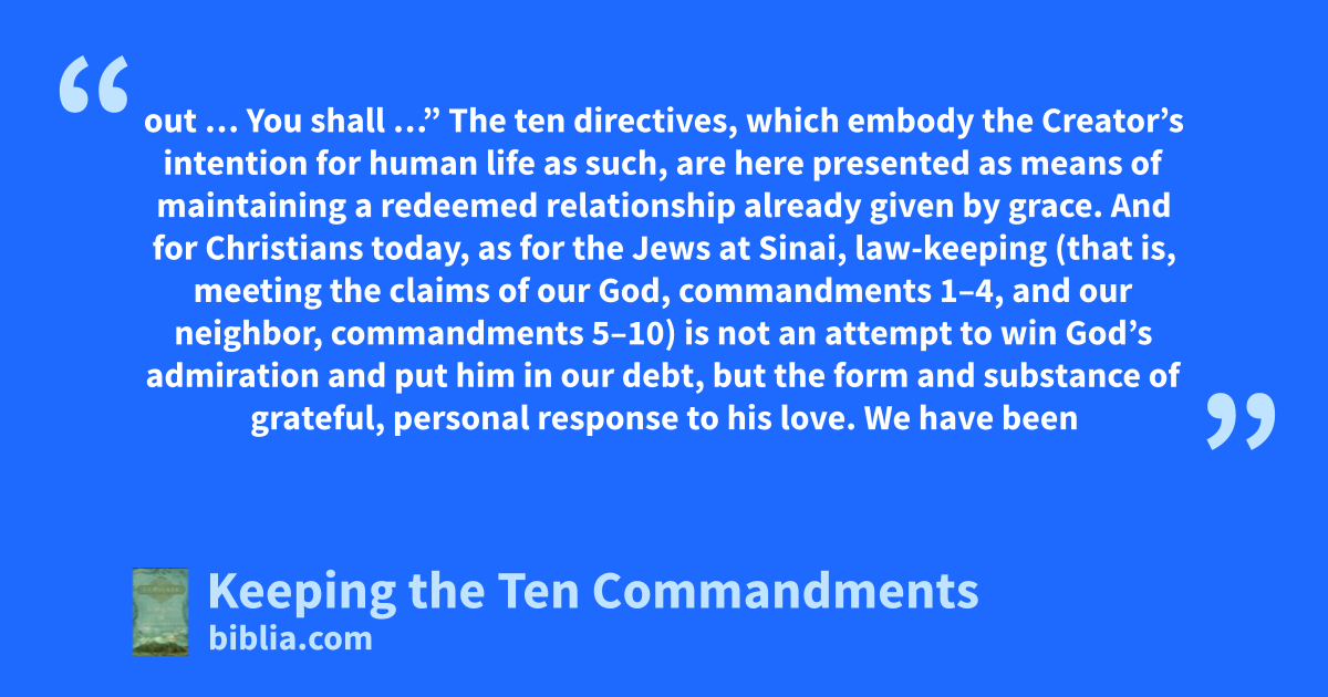 out … You shall …” The ten directives, which embody the Creator’s intention for human life as such, are here presented as means of maintaining a redeemed relationship already given by grace. And for Christians today, as for the Jews at Sinai, law-keeping (that is, meeting the claims of our God, commandments 1–4, and our neighbor, commandments 5–10) is not an attempt to win God’s admiration and put him in our debt, but the form and substance of grateful, personal response to his love. We have been