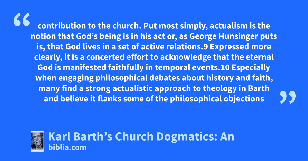 contribution to the church. Put most simply, actualism is the notion that God’s being is in his act or, as George Hunsinger puts is, that God lives in a set of active relations.9 Expressed more clearly, it is a concerted effort to acknowledge that the eternal God is manifested faithfully in temporal events.10 Especially when engaging philosophical debates about history and faith, many find a strong actualistic approach to theology in Barth and believe it flanks some of the philosophical objections