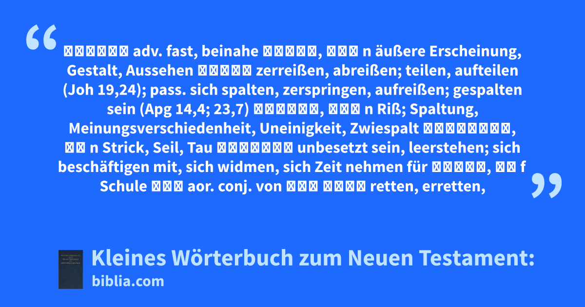 Vollständiges griechisch-deutsches Wörterbuch zum Neuen Testament. Der Inhalt bezieht sich auf das gesamte Vokabular der beiden Textausgaben Nestle-Aland, Novum Testamentum Graece, 27. Aufl., und The Greek New Testament (Fourth Revised Edition) einschließlich der Varianten im jeweiligen Apparat.